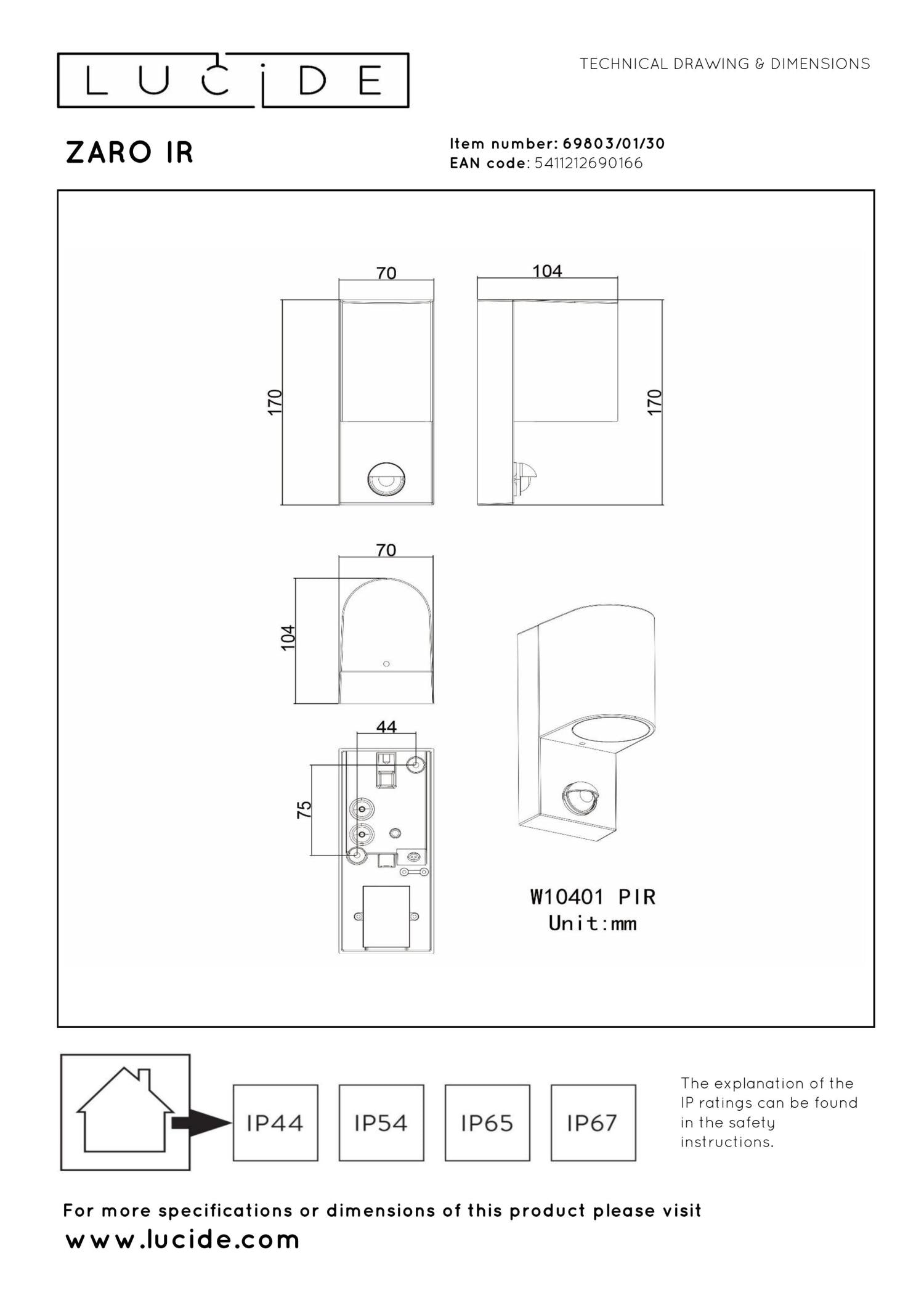 Een buitenlamp met bewegingssensor geeft je een veilig gevoel en helpt je snel je huissleutel vinden als je in het donker thuiskomt. Maar Zaro IR is zoveel meer: deze compacte, moderne wandspot is vervaardigd uit hoogwaardig aluminium en kan zowel opwaarts als neerwaarts gericht worden om je gevel of tuinpad te verlichten. Zo geniet jij ook 's avonds van je buitenruimte. Plaats Zaro IR in serie voor een maximaal effect. De stijlvolle spot is 17 centimeter hoog en 10,4 centimeter breed, en is geschikt voor ledlichtbronnen.